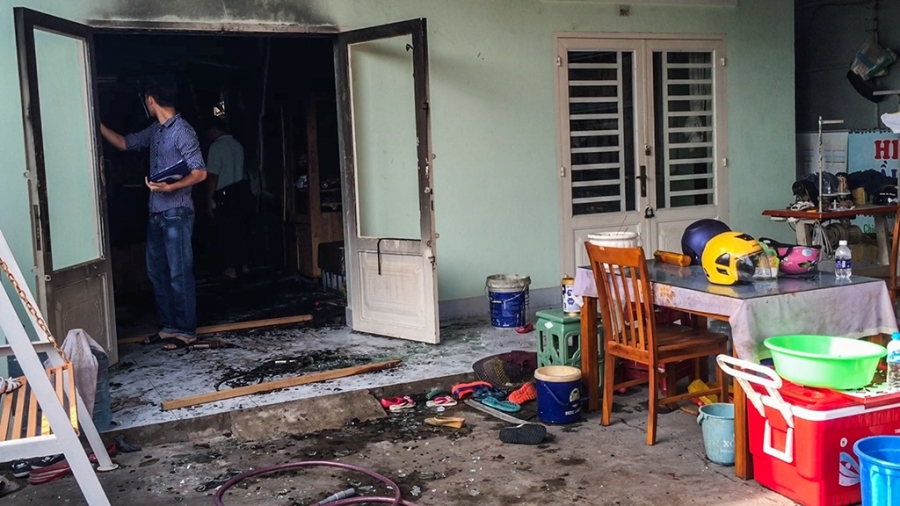 Thời điểm chúng tôi có mặt, cả khu phố vẫn chưa hết bàng hoàng trước tai họa ập xuống gia đình anh Diệp. Căn nhà gia đình anh Diệp gặp nạn được thiết kế như nhà trọ, gồm một trệt và gác lửng, cổng và hàng rào khá kiên cố. Quan sát trong sân, vài vật dụng, xe máy chém sém được đưa ra bên ngoài. Trong phòng khách cùng một số đồ đạc trong nhà bị cháy rụi.