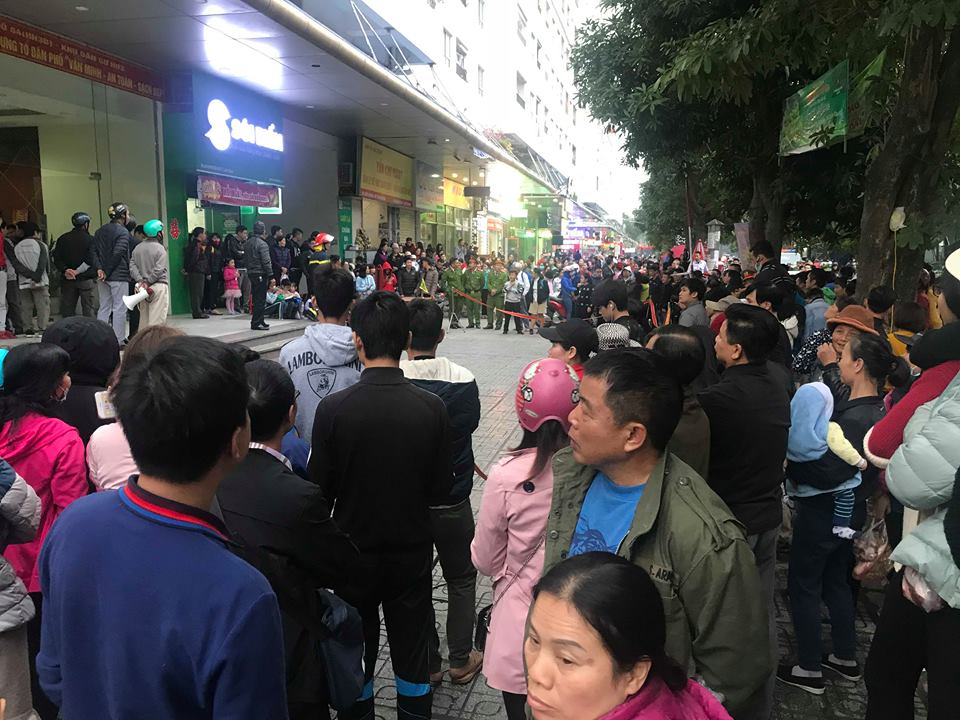 Rất đông người dân tập trung dưới sảnh tòa nhà.