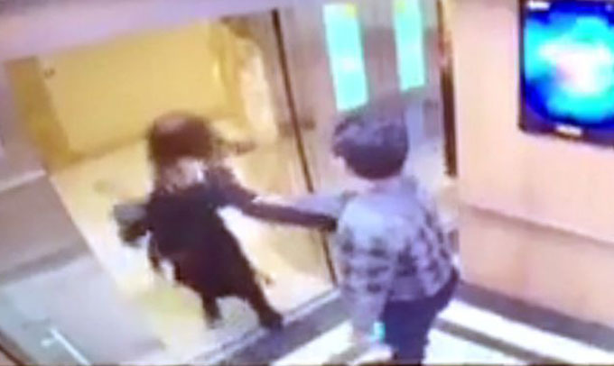 Hình ảnh chị V. bị cưỡng hôn trong thang máy.