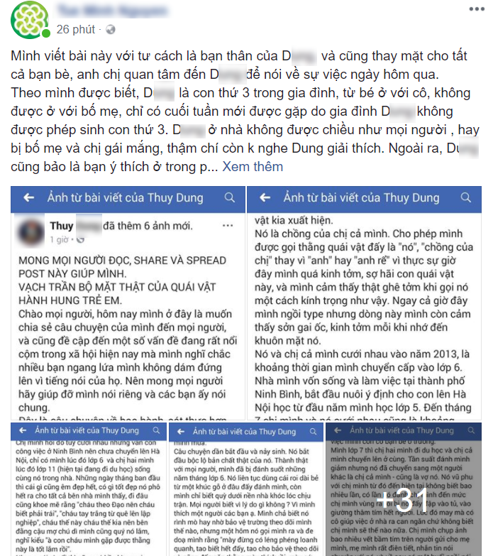 Ngoài ra, bài viết của T.M.N cũng cho hay: D. là con thứ 3 trong gia đình, từ bé ở với cô không được ở với bố mẹ, chỉ có cuối tuần mới được gặp do gia đình. D. ở nhà không được chiều như mọi người, hay bị bố mẹ và chị gái mắng, thậm chí còn không nghe D. giải thích. Ngoài ra, D. cũng bảo là bạn ý thích ở trong phòng một mình, ở nhà thường không hay nói chuyện với ai. Chính vì như vậy nên mình nghĩ là bạn bè sẽ là những người hay tiếp xúc với D. và hiểu D. nhất.