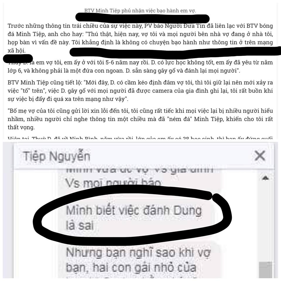 Hai ngày nay, dư luận xôn xao sự việc BTV bóng đá Minh Tiệp liên quan đến lùm xùm bạo hành, đánh đập em vợ. Theo đó, Thuỳ D., em vợ Minh Tiệp đã lên một diễn đàn mạng xã hội để “tố” anh rể mình thường xuyên đánh đập cô từ năm lớp 6 đến nay (lớp 10) với hình ảnh môi bị sưng tấy, khiến nhiều người bất ngờ.