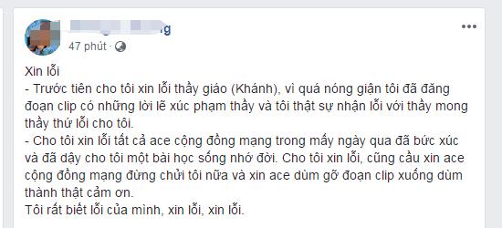 “Trước tiên cho tôi xin lỗi thầy giáo (Khánh), vì quá nóng giận tôi đã đăng đoạn clip có những lời lẽ xúc phạm thầy, mong thầy thứ lỗi cho tôi.