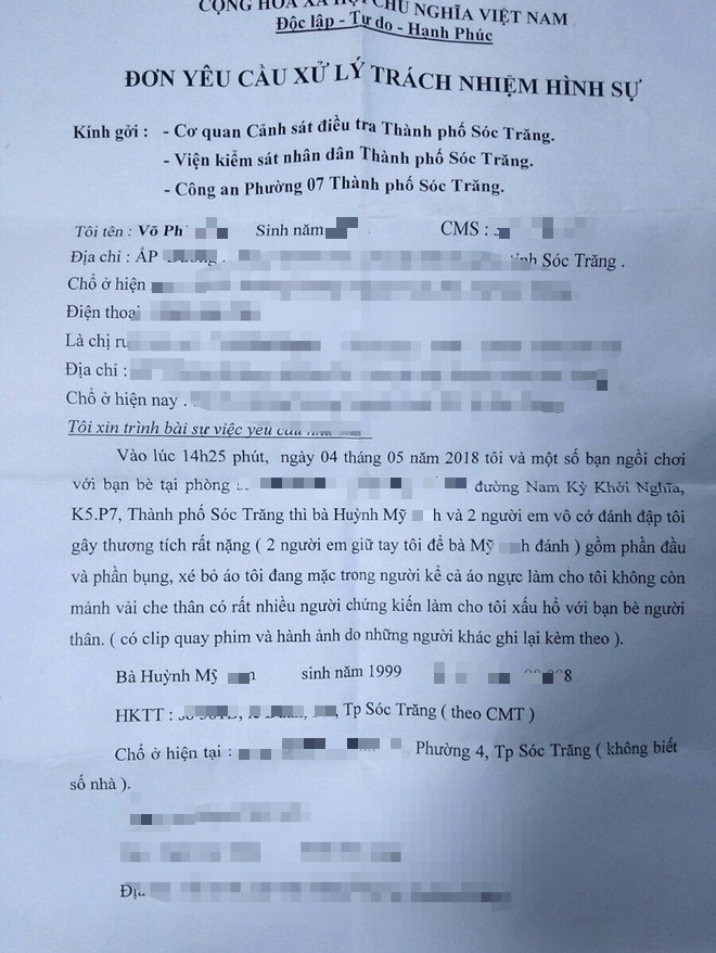 Đơn tố cáo của cô gái bị đánh ghen. Ảnh: Phunuvietnam