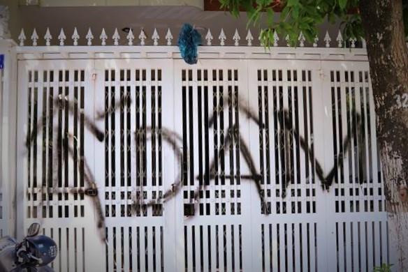 Dòng chữ “Ấ DÂM”, bị ai đó xịt bằng sơn đen lên cổng sắt đã được sơn lấp, nhiều chất bẩn như; bao rác, mắm ruốc, dầu nhớt được dọn dẹp sạch sẽ.