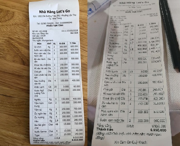 Theo đó, hóa đơn của ông Hùng Anh cung cấp được in lúc 21 giờ 2 phút ngày 6/5 có tổng tiền thanh toán là 9.950.000 đồng, phía nhà hàng Let's Go cung cấp được in lúc 10 giờ 11 phút ngày 7/5 có tổng tiền là 9.010.000 đồng. Hiện công an Khánh Hòa vẫn đang điều tra làm rõ sự chênh lệch giá tiền này.