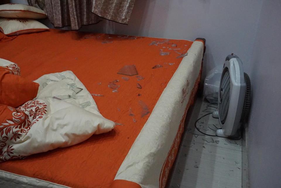 Giường ngủ của vợ chồng chị Hương bị kính bắn tung tóe.