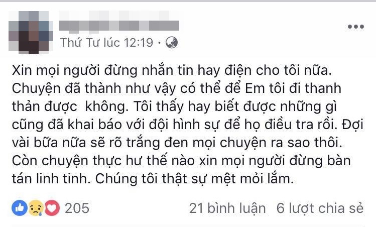 Theo đó, Q xin mọi người đừng nhắn tin, gọi điện cho anh nữa. Q. cho biết hiện tại bản thân đang rất mệt mỏi, mong mọi người đừng bàn tán thêm. Mọi việc hãy để cơ quan điều tra làm rõ.