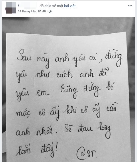 Trước khi xảy ra sự việc đau lòng, theo thông tin trên báo Lao động, ngày 14/4, nữ sinh V.A đăng tải nhiều dòng trạng thái trên trang cá nhân Facebook, than thở chuyện tình cảm, sự tin tưởng trong tình yêu.