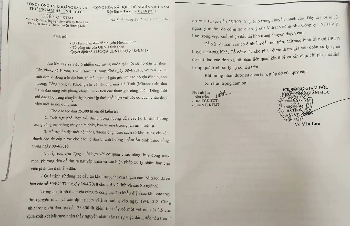 Theo đó, ngày 24/4 vừa qua, Công ty Mitraco đã có văn bản gửi các cơ quan chức năng tại Hà Tĩnh nhận phần trách nhiệm khi để xảy ra sự cố rò rỉ dầu từ téc chứa dầu của công ty làm ảnh hưởng đến các hộ dân trong thời gian vừa qua.