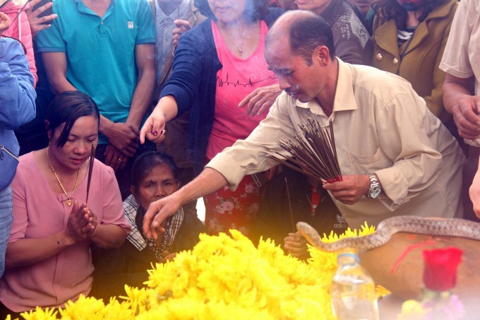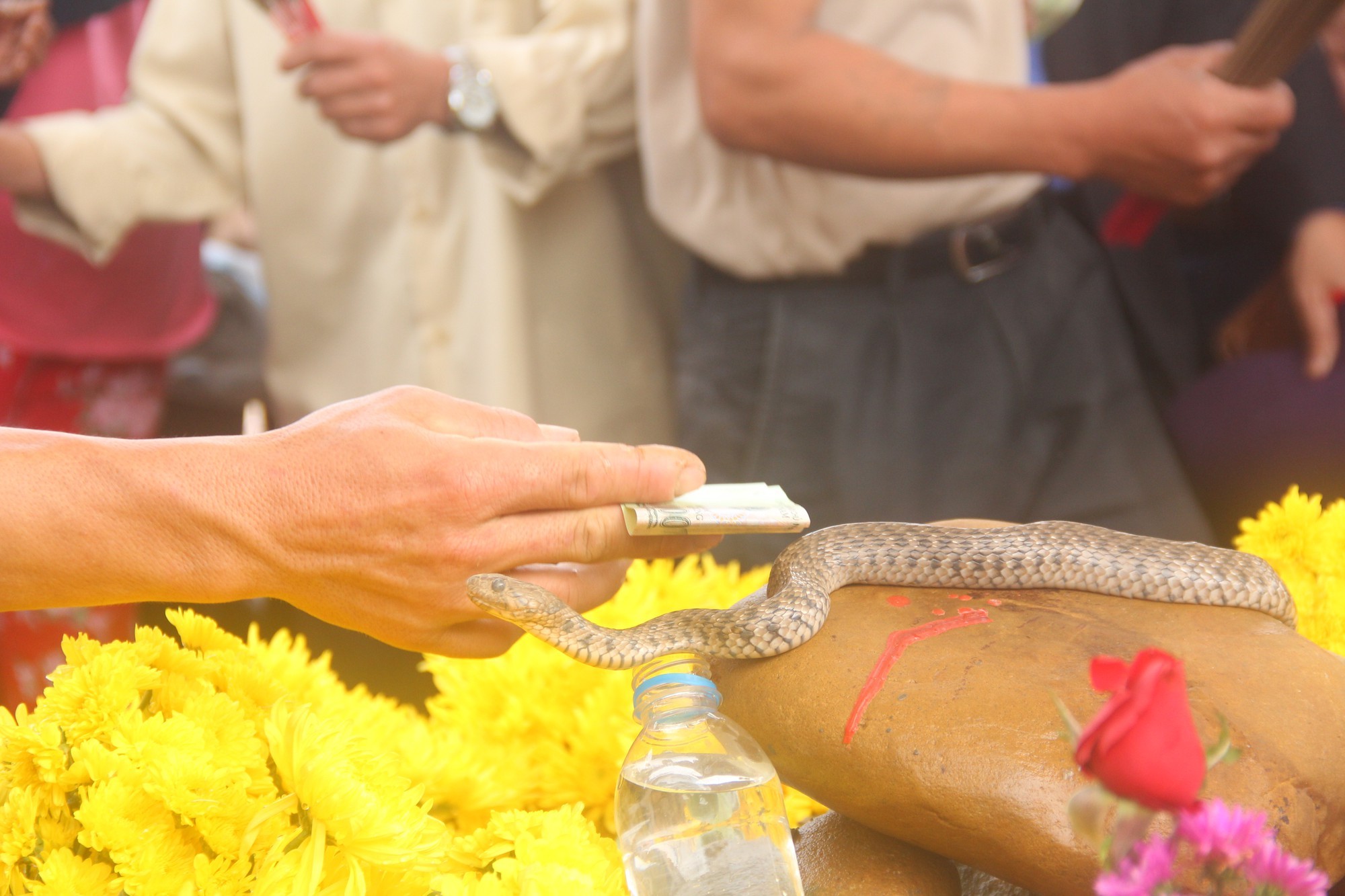 Nhiều người “dâng” tiền cho con rắn. Ảnh: H. Long