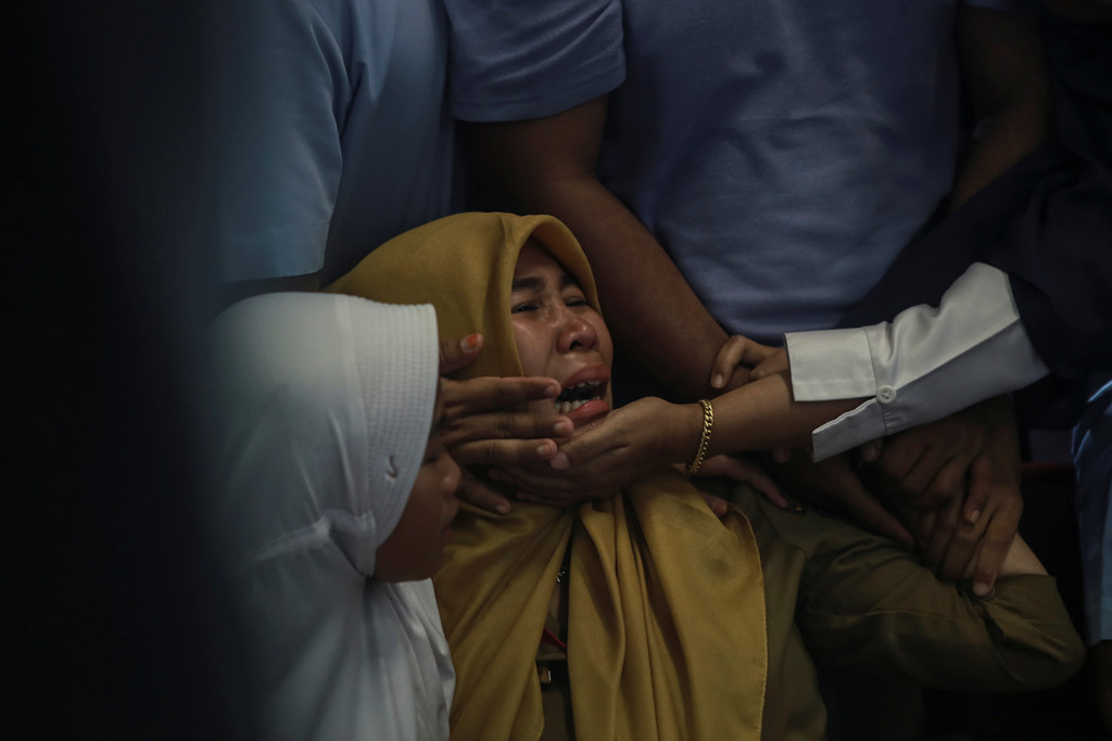 Người thân của các hành khách trên chuyến bay JT610 bật khóc tại sân bay Depati Amir ở Pangkal Pinang khi hay tin. Ảnh: Reuters.