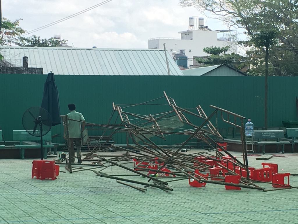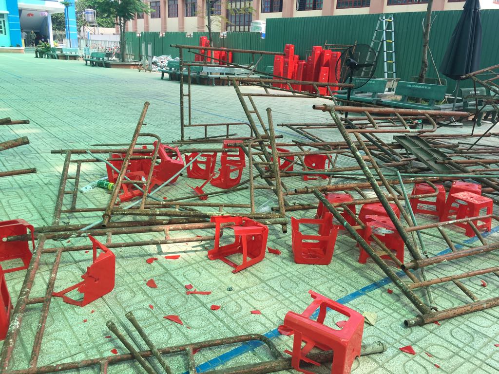 Tại hiện trường, khoảng 6 khung giàn giáo đổ sập, làm vỡ nát nhiều ghế nhựa, văng tung toé. Nhiều chiếc bông hoa hồng, gấu bông dâng lên thầy cô kính yêu trong ngày 20/11 của các em học sinh chưa kịp tặng đã vỡ nát, nằm lăn lóc dưới sân trường vì tai nạn bất ngờ.