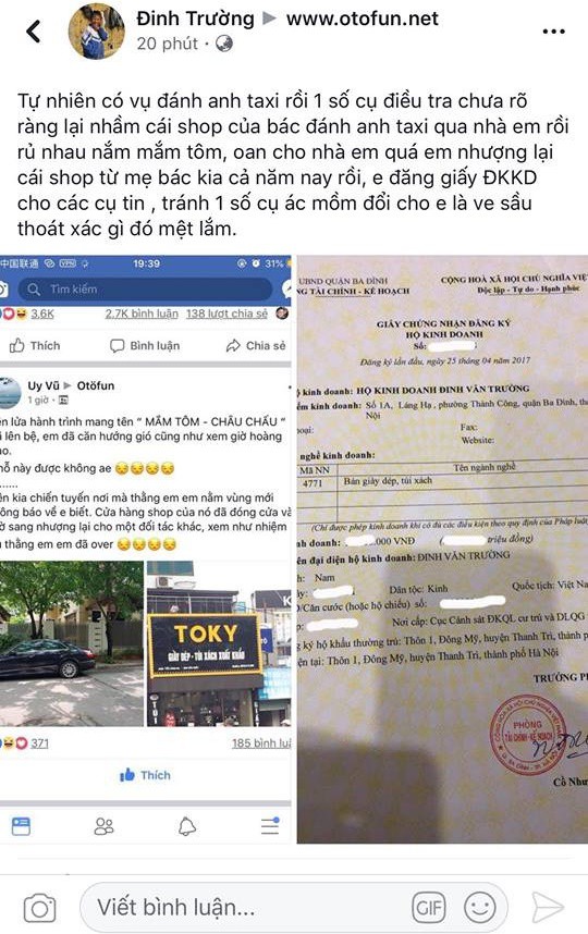Tuy nhiên, cửa hàng ở địa chỉ 1A Láng Hạ nói trên cũng không thuộc quyền sở hữu của tài xế Vũ Thái nữa mà đã được chuyển nhượng kinh doanh cho anh Đinh Văn Trường (SN 1991), chủ cửa hàng TOKY ở số 1A Láng Hạ, chuyên kinh doanh giày dép, túi xách.