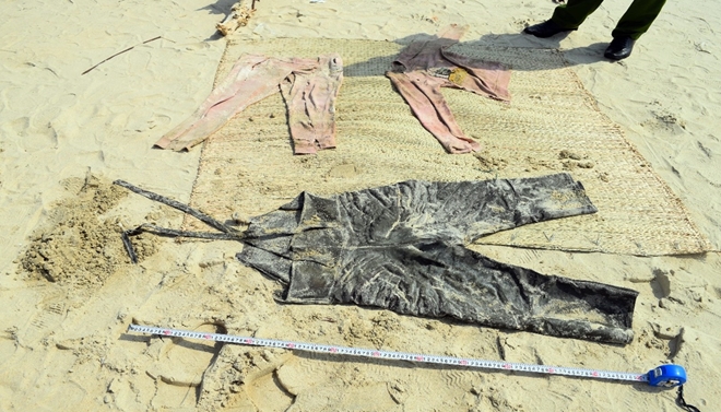 Trên người nạn nhân bên ngoài mặc 1 bộ đồ bảo hộ lao động áo liền quần có 2 dây đeo lên vai, chất liệu bằng cao su, mặt trong có in logo ký hiệu bằng tiếng nước ngoài; bên trong mặc bộ đồ dài tay, vải thun màu hồng, vùng cổ đứt ngang đốt sống cổ C1, mất 2 bàn tay và chân trái phân hủy đứt rời; tử thi đã vào giai đoạn sáp hóa, đang trong thời kỳ phân hủy gần hoàn toàn các gân, cơ và dây chằng.