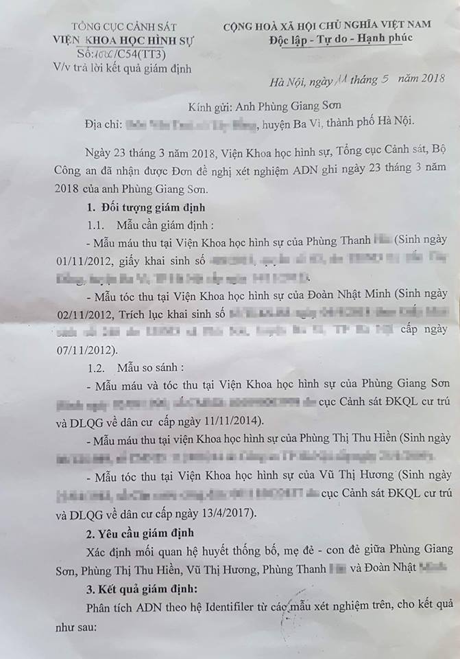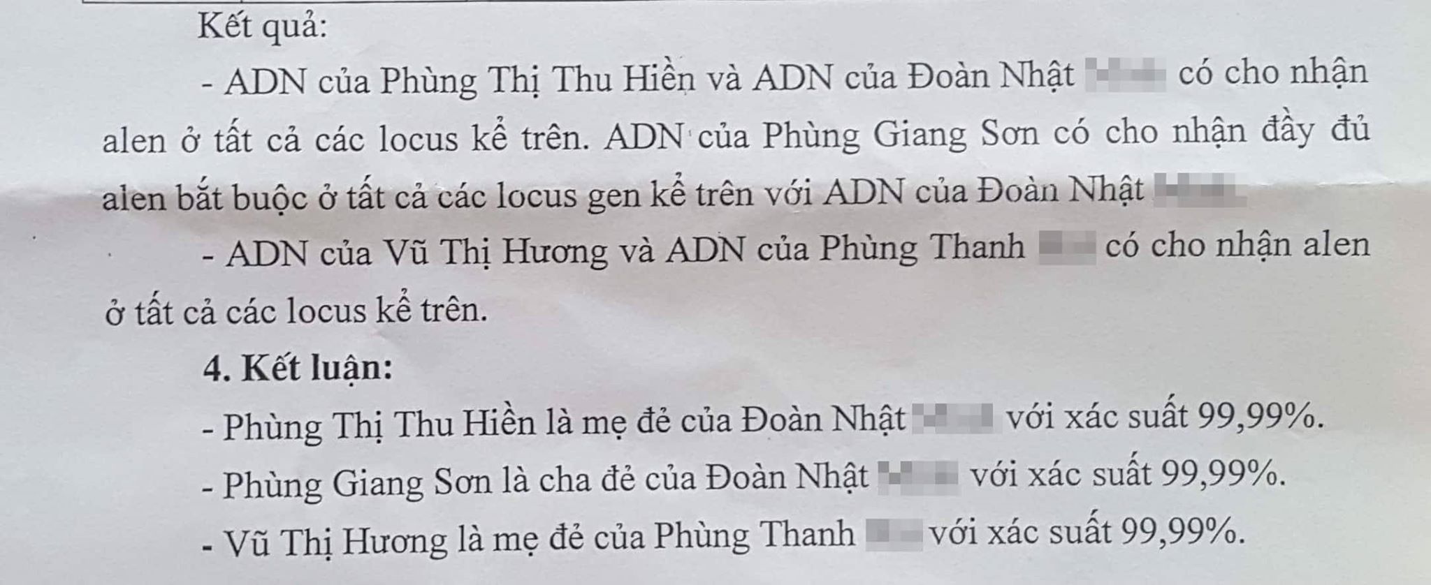 Kết quả giám định ADN việc trao nhầm con giữa hai gia đình.