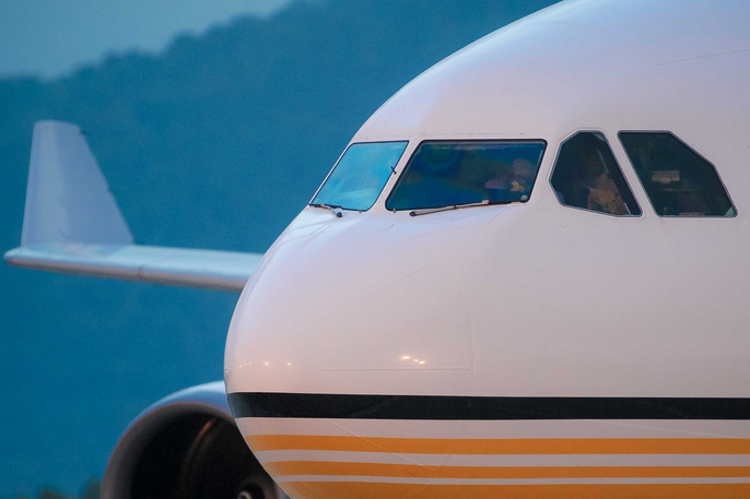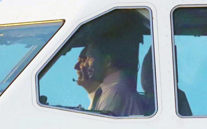 Quốc vương Brunei Hassanal Bolkiah xuất hiện trong buồng lái khi chiếc chuyên cơ A340-212 của ông hạ cánh tại Sân bay Quốc tế Đà Nẵng ngày 9-11. Ảnh: Hoàng Triều
