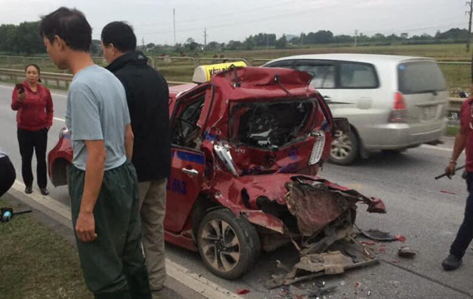 Chiếc xe taxi đưa nạn nhân vụ tai nạn ngay sau đó bị xe tải đâm từ phía sau biến dạng.