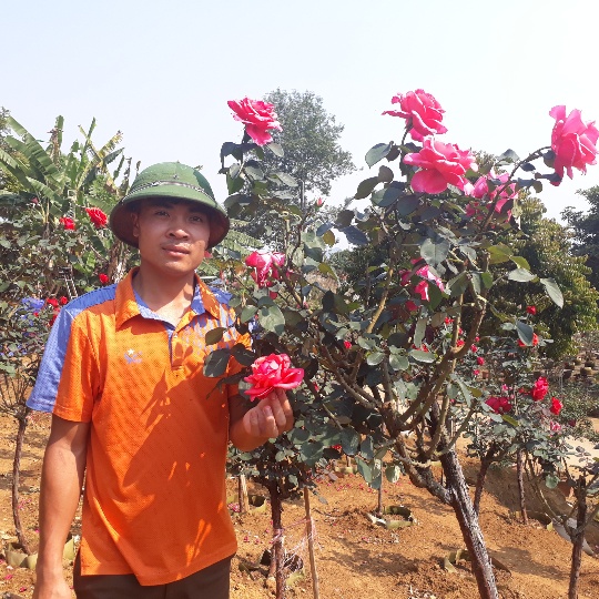 Chủ nhân của vườn hồng thân gỗ đẹp như mơ đó là Lê Duy Khương (1993), ở tổ 21 ̣(phường Tân Phong, thành phố Lai Châu, tỉnh Lai Châu). Khi chúng tôi đến, Khương đang cắm cúi cắt tỉa bên vườn hồng thân gỗ, cây nào, cây nấy cũng cao lênh khênh, nở hoa đỏ rực, bắt mắt.