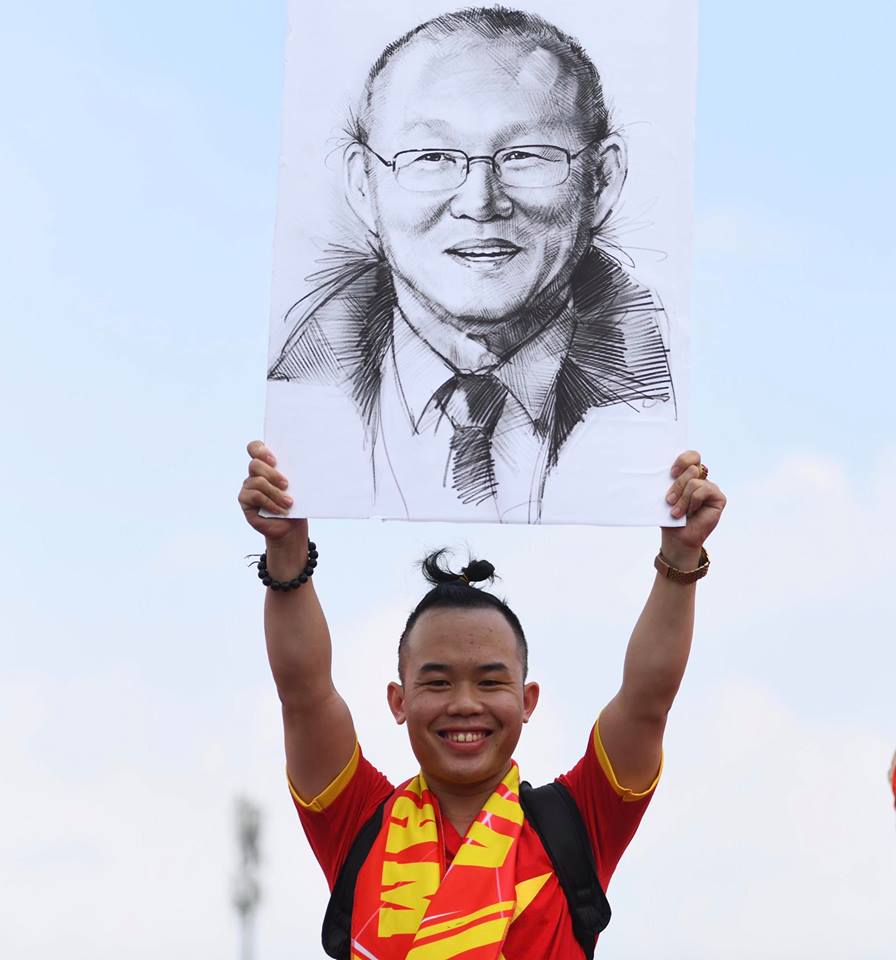 Có mái tóc in hình huấn luyện viên Park Hang-seo “chất như nước cất”, anh Đặng Hiệp Hoà (26 tuổi, một cổ động viên đến từ Quảng Nam) cho biết, vì đam mê bóng đá nên anh đã xin nghỉ làm bắt xe khách từ quê ra Hà Nội cổ vũ cho đội tuyển Việt Nam.