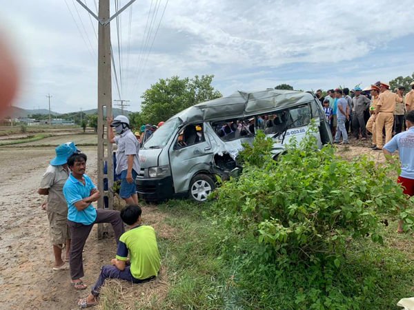 Xe 16 chỗ biến dạng hoàn toàn sau va chạm. Ảnh: báo Thanh Niên