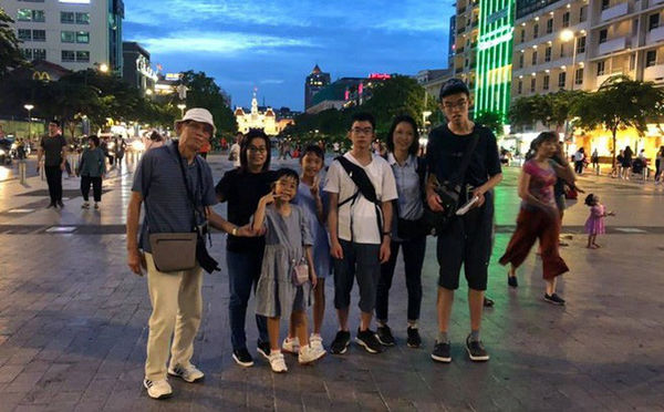 Cụ Oki (ngoài cùng, bên trái) chụp ảnh kỷ niệm cùng gia đình trong chuyến du lịch.