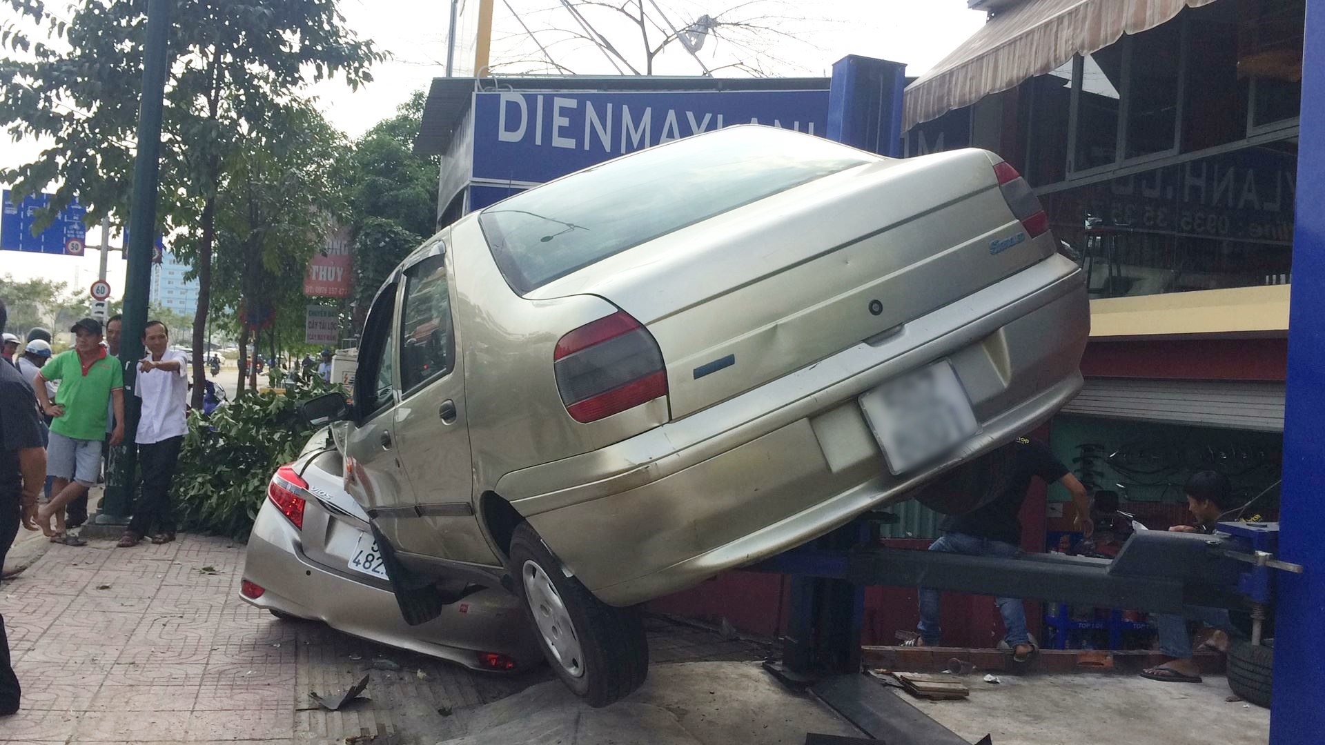 Người dân trong tiệm sửa xe phát hiện vụ việc nên hô hoán tháo chạy. Tại hiện trường, chiếc xe hư hỏng nặng, kính chắn gió bể nát, nhiều mãnh vở văng trên vỉa hè. Cây xanh cũng bị hư hại, vụ việc khiến nhiều người dân chứng kiến hốt hoảng.