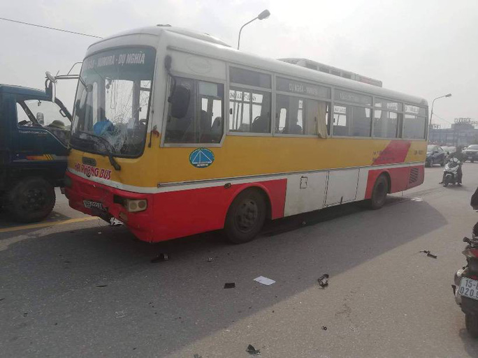 Xe buýt nghi chạy lấn làn trên cầu An Dương (Hải Phòng), đâm trực diện xe máy khiến 2 nam sinh bị thương. Ảnh: Người lao động