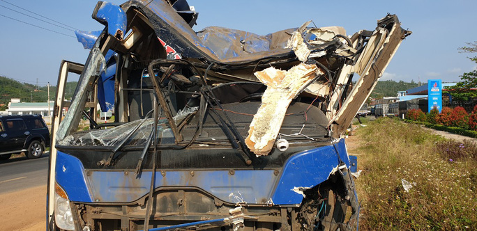 Chiếc xe khách bẹp dúm sau vụ tai nạn. Ảnh: Báo Người Lao Động