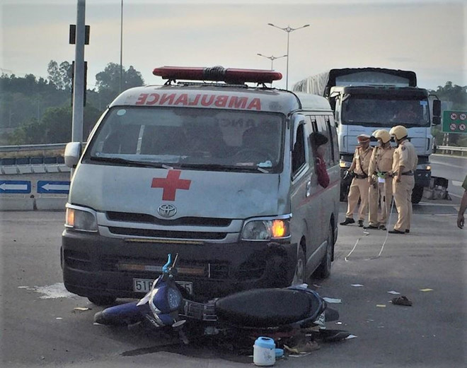 Vụ tai nạn giữa xe cứu thương và xe máy xảy ra tại giao lộ cao tốc Đà Nẵng - Quảng Ngãi lúc 6h15 ngày 7/8 khiến 2 người bị thương, nguy kịch.