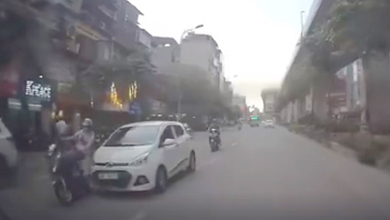 Chiếc xe ô tô tông một người đang đi xe máy trên phố. Ảnh cắt từ clip.