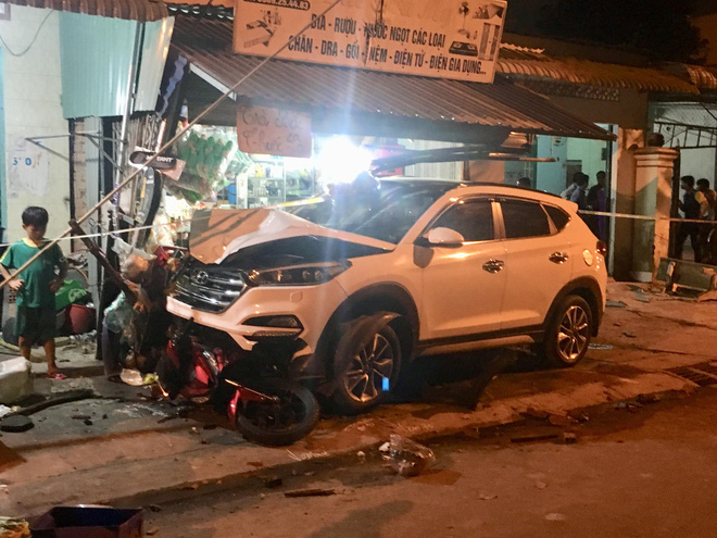 Sau đó xe ô tô mất lái nên tông tiếp vào 4 xe máy và một số người đang ngồi ở lề đường. Chiếc xe gây tai nạn chỉ dừng lại khi lao vào tiệm tạp hóa bên đường.