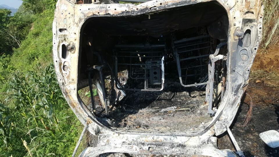 Sau khi lao xuống vực chiếc xe bị bốc cháy trơ khung, lực lượng cảnh sát PCCC tỉnh Lào Cai đã được điều động đến hiện trường dập lửa.