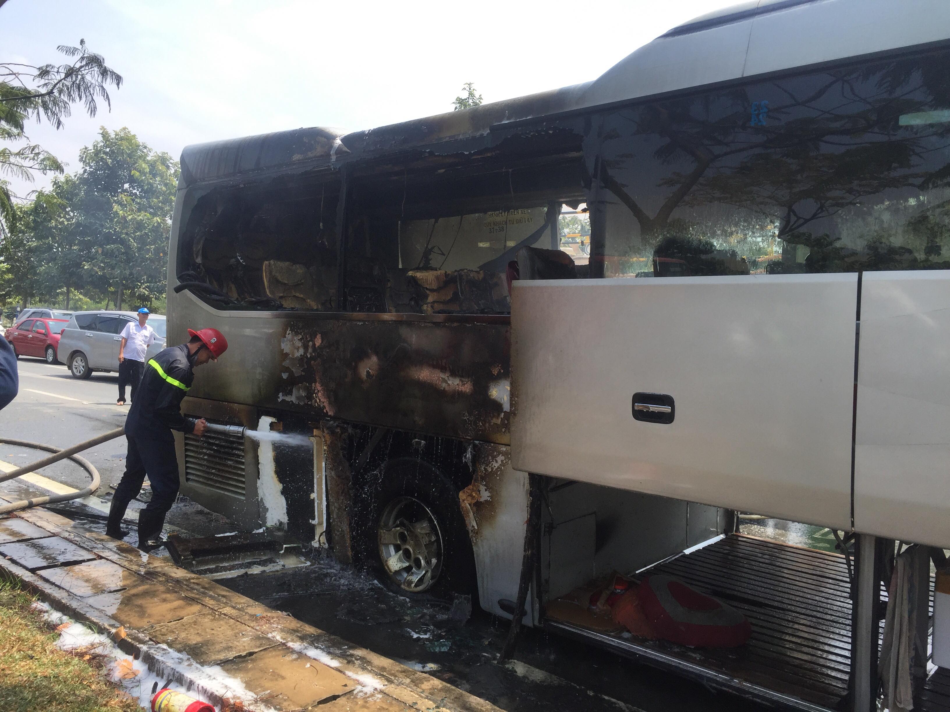 Khi phương tiện di chuyển gần đến giao lộ với đường Trần Não, quận 2 thì bánh xe sau bất ngờ phát nổ, tài xế nhanh chóng điều khiển xe khách tấp vào lề đường. Bất ngờ chiếc xe bốc cháy dữ dội bên hông của chiếc xe.