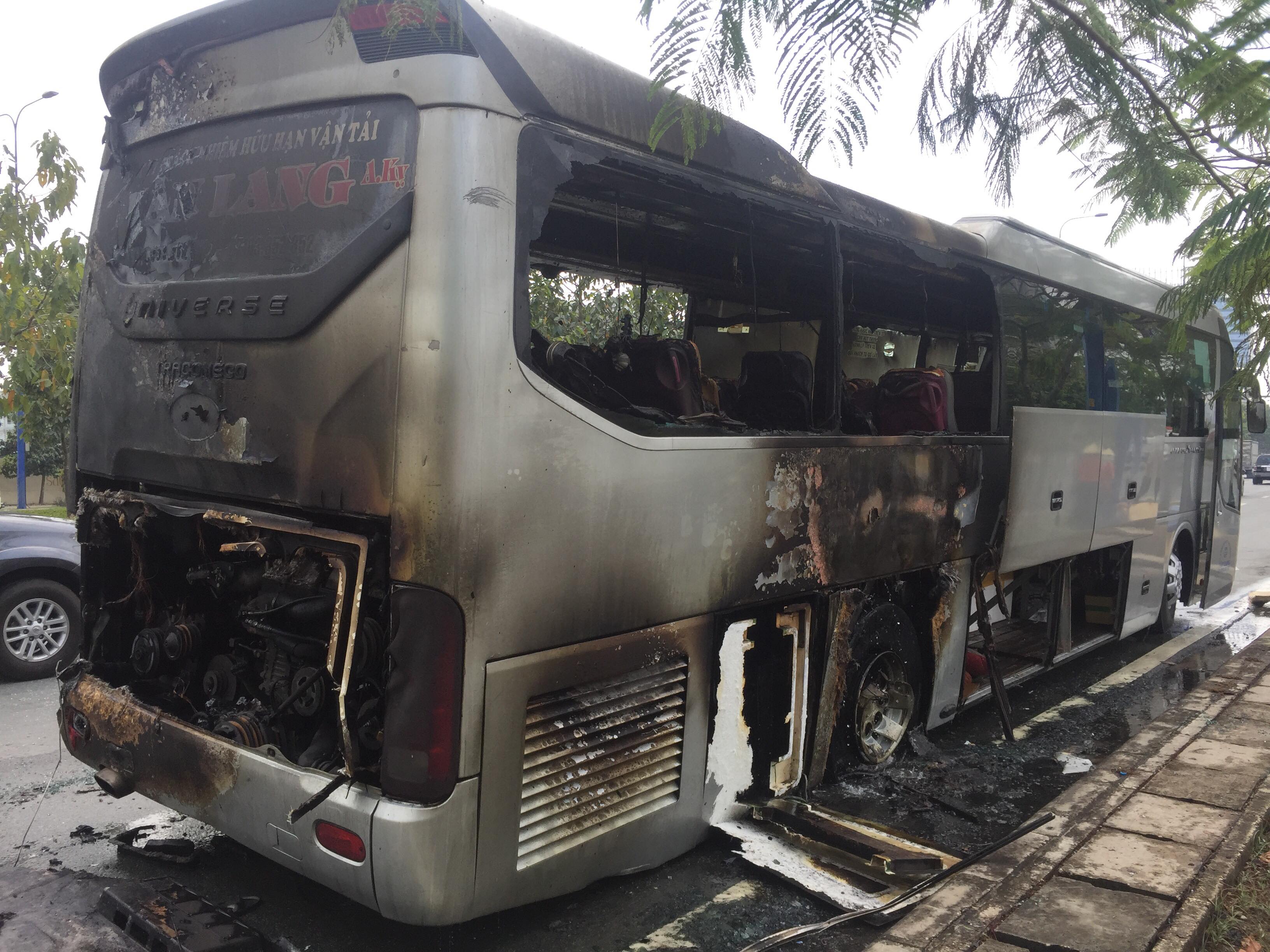 Tại hiện trường, chiếc xe khách bị cháy trơ khung một bên hông, nhiều ghế ngồi bong tróc, cửa kính vỡ nát… Tuy không có thương vong về người. Vụ việc khiến giao thông qua khu vực ùn ứ.