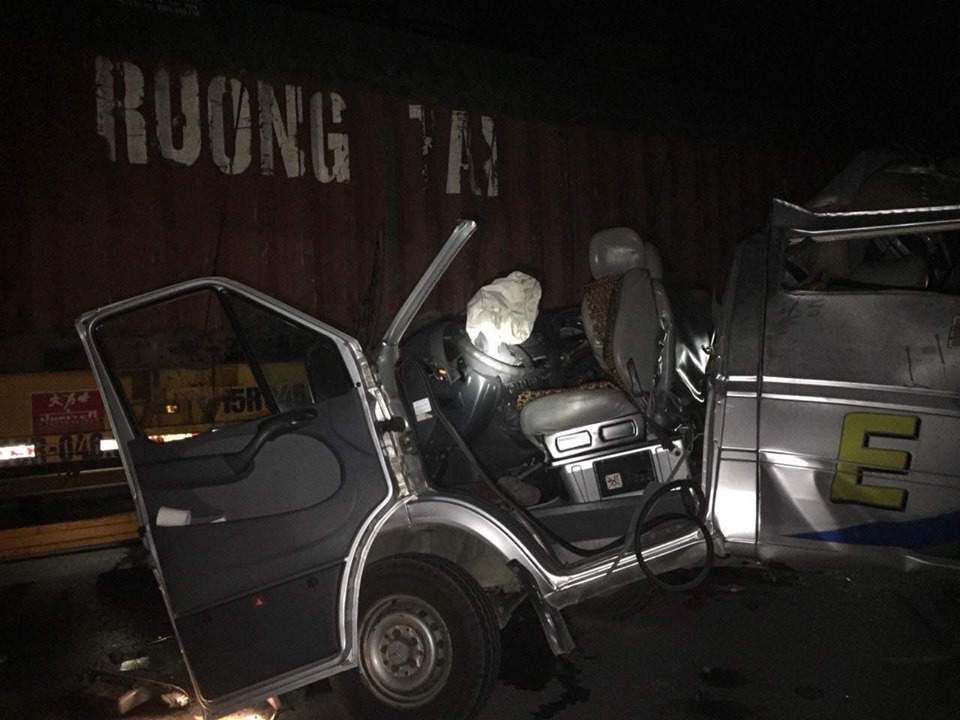 Qua xác định xe container đi trước, giảm tốc độ, định tạt vào lề đường bên phải (do tài xế phát hiện xe có sự cố) thì xe khách 16 chỗ đi sau vượt lên va chạm vào bên trái đuôi xe container.