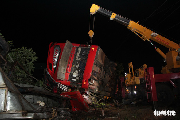 Sau khi xảy ra tai nạn, lực lượng chức năng đã có mặt tại hiện trường và điều động xe cẩu tới cẩu xe khách đưa thi thể bà Chánh ra ngoài.