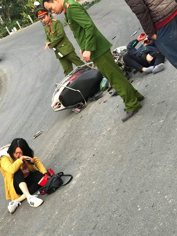 Cú va chạm mạnh làm cô gái ngồi sau bị thương nặng gãy một bên đùi, thanh niên cầm lái bị thương nặng nằm bất tỉnh dưới đường.