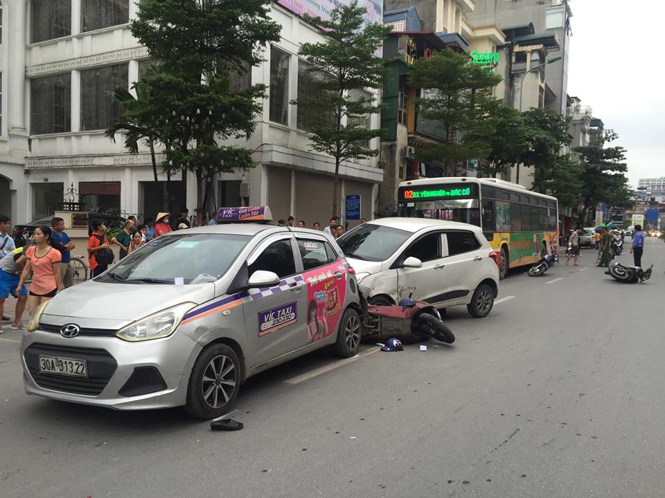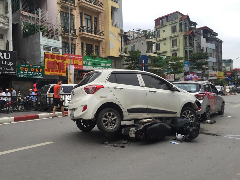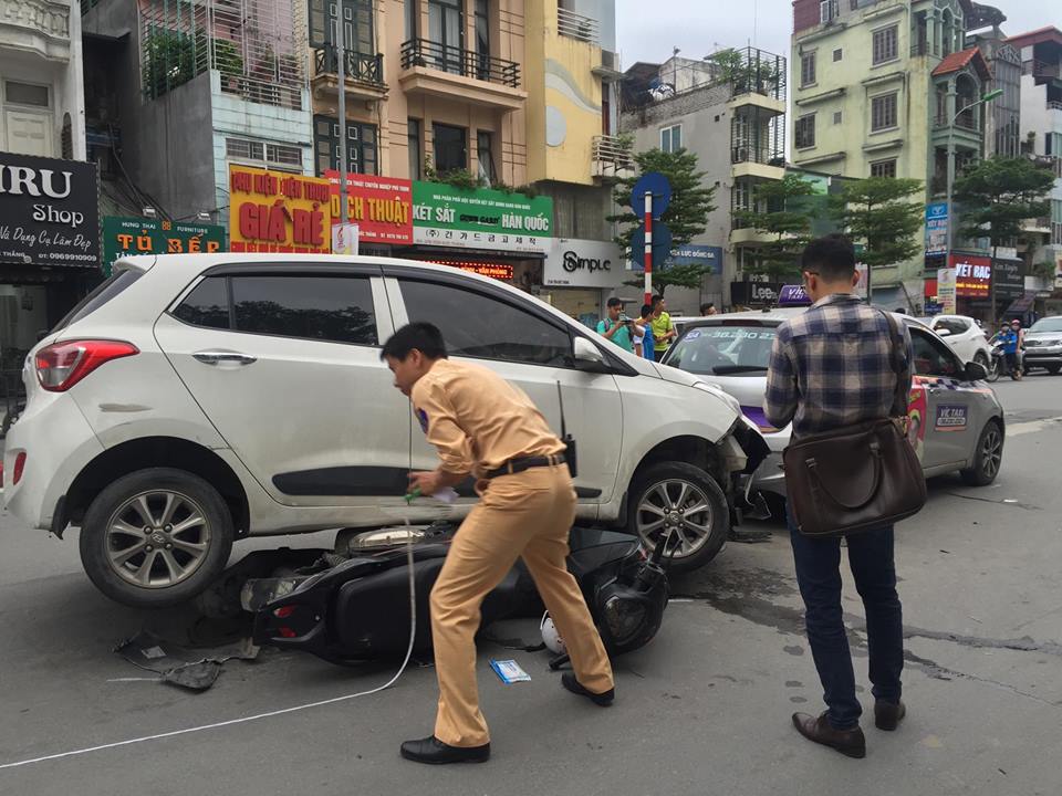 Tại hiện trường, sau khi gây tai nạn, chiếc xe ô tô vẫn còn chênh vênh trên một chiếc xe máy SH, phía đầu xe gây tai nạn là chiếc xe taxi và một chiếc xe máy khác. Vụ việc khiến nhiều người vây quanh tuyến đường theo dõi.