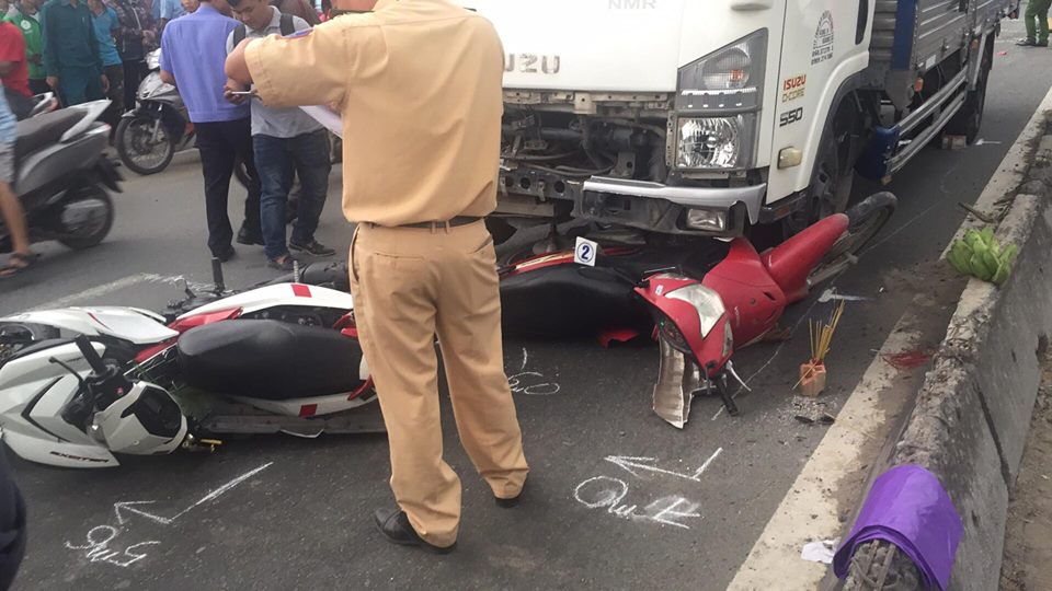 Tại hiện trường, 2 xe máy bị cuốn vào gầm trước xe tải vỡ nát hư hỏng nặng, một xe còn lại hư hỏng nhẹ. Nhận được tin báo, lực lượng chức năng quận 12 có mặt tiến hành phong tỏa, khám nghiệm hiện trường, ghi lời các nhân chứng để làm rõ nguyên nhân tai nạn.