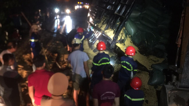 Rất may vụ cháy không gây thương vong về người nhưng chiếc ô tô tải đã bị cháy hư hỏng nặng, nhiều tấn ngô đã bị lửa cháy đen.