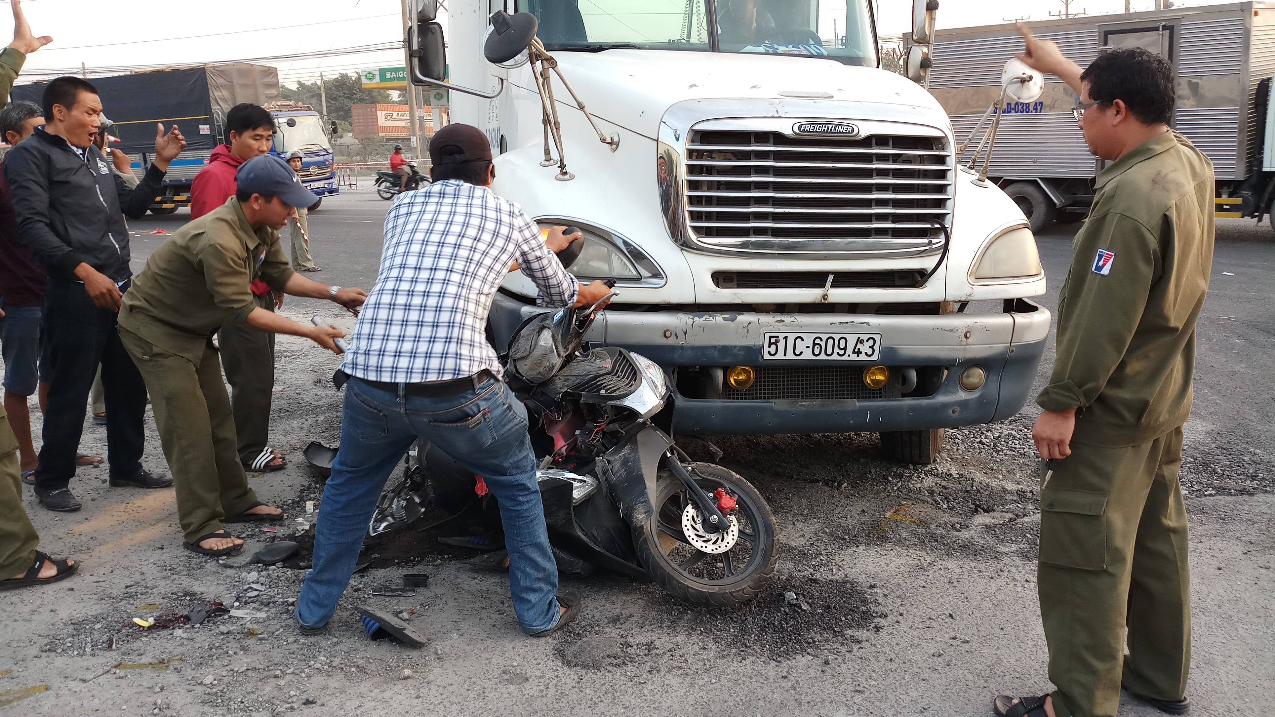 Tại hiện trường, chiếc xe tay ga bị cán nát vụn, mắc kẹt dưới gầm trước xe đầu kéo.
