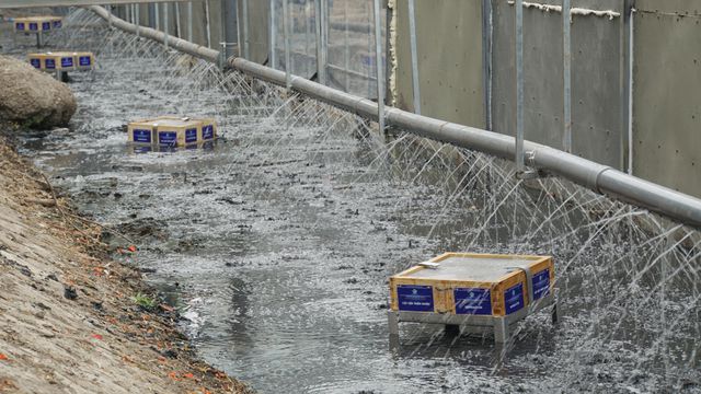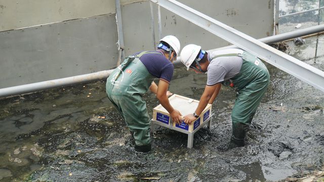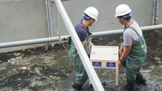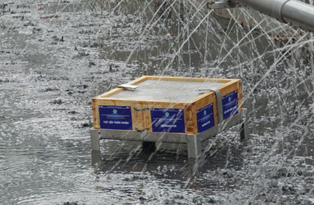 Bên trong rào quây, các chuyên gia đặt 4 tấm vật liệu Bioreactor. Nước nano liên tục bơm vào khu vực để tạo dòng chảy lưu thông.