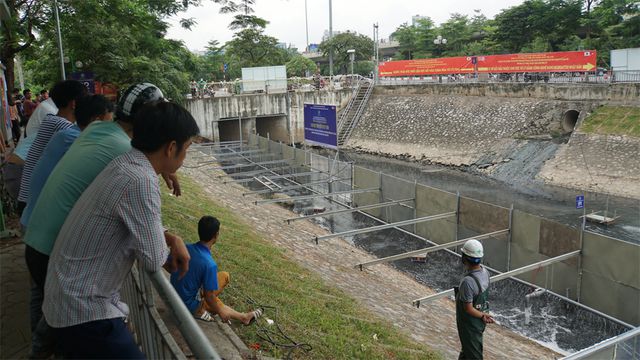 Người dân theo dõi quá trình xử lý bùn ở sông Tô Lịch bằng công nghệ Nhật Bản.