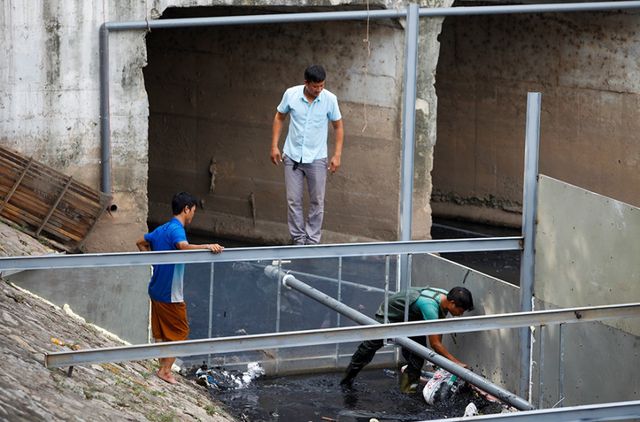 Các công nhân đang chèn thêm bao cát vào khu vực hàng rào sắt để tránh lượng nước thải chảy ra ngoài.