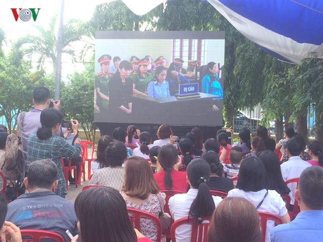 Người dân theo dõi phiên tòa qua màn hình ngoài trời. Ảnh: VOV.