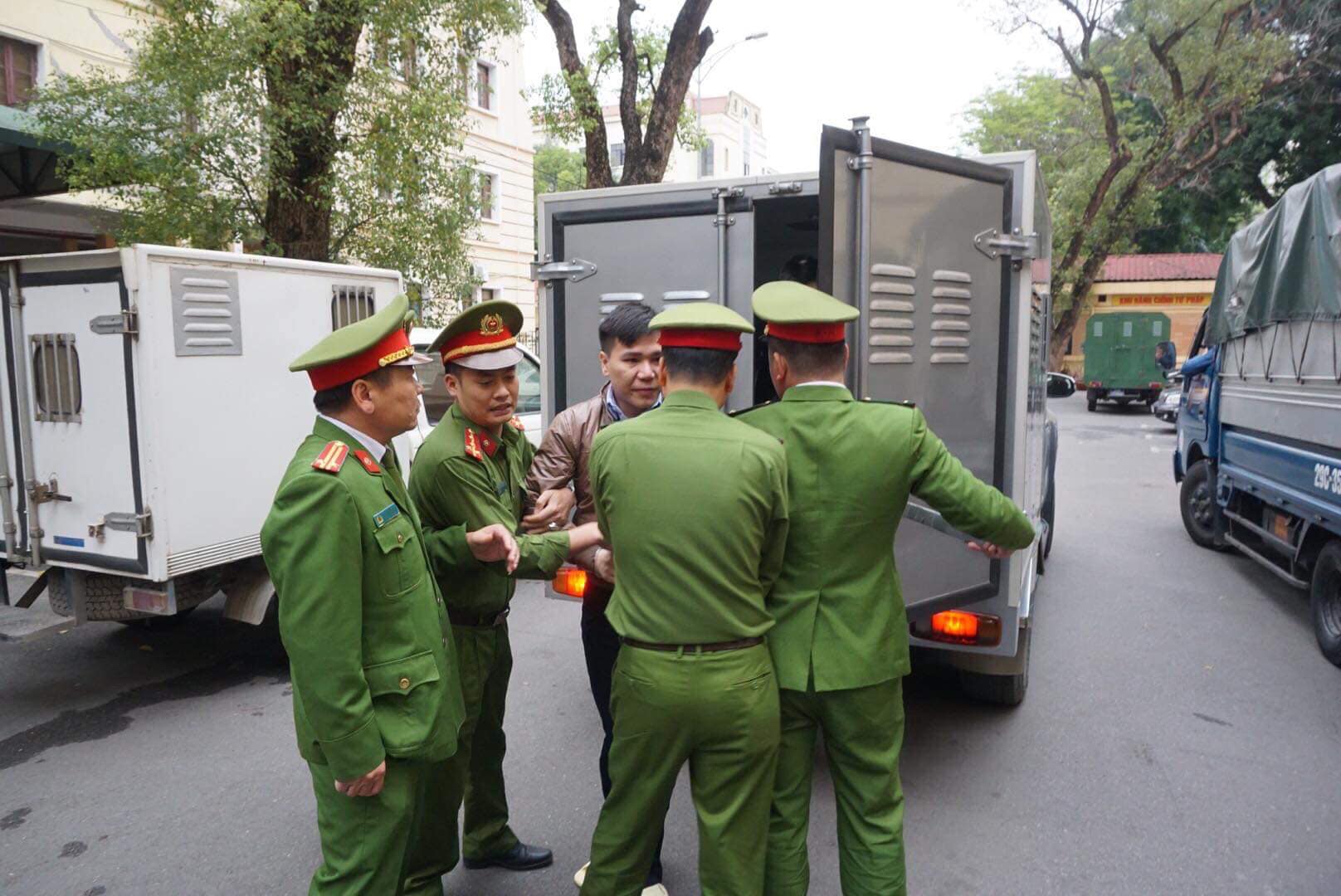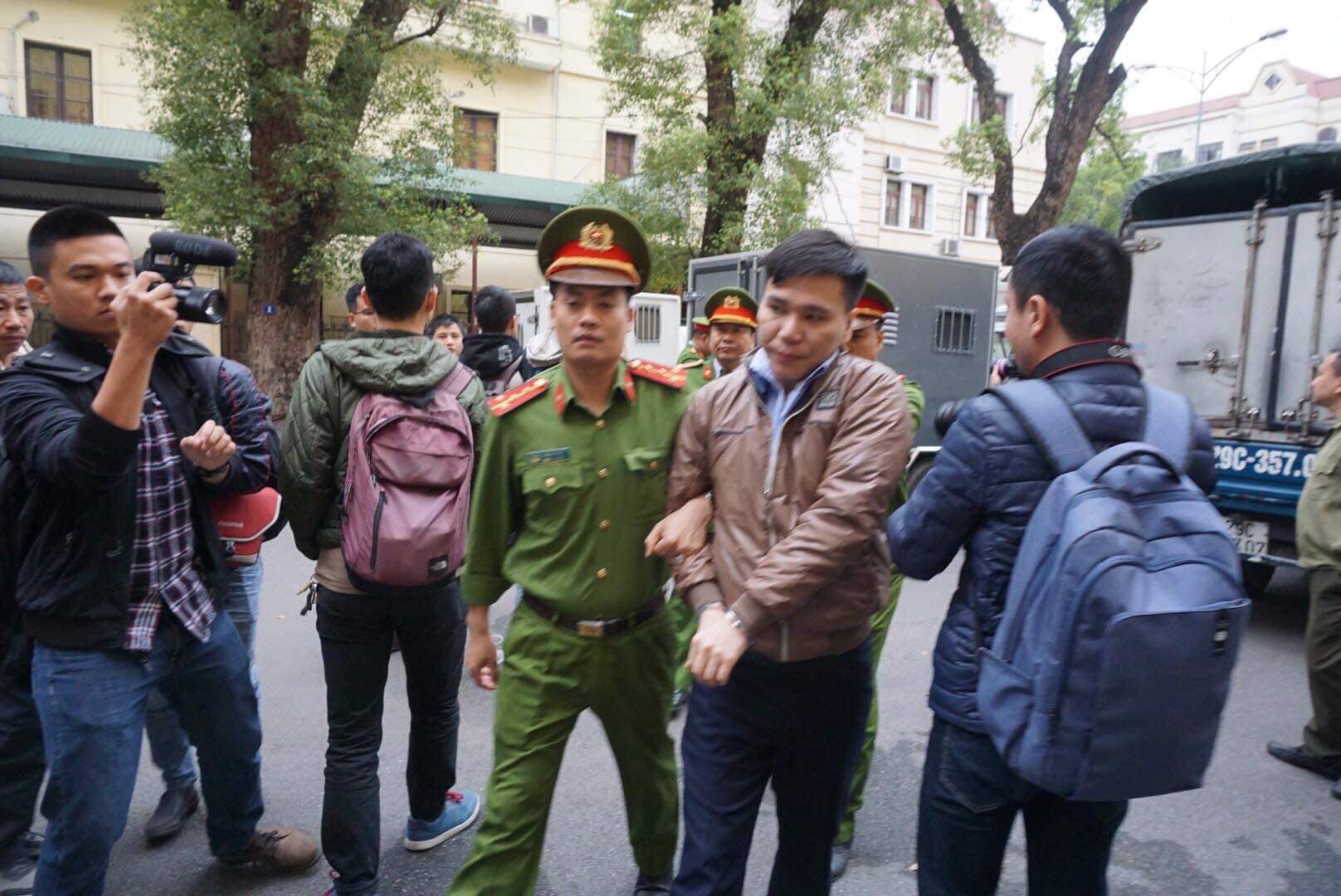 Lực lượng chức năng dẫn Châu Việt Cường vào phòng xử án.