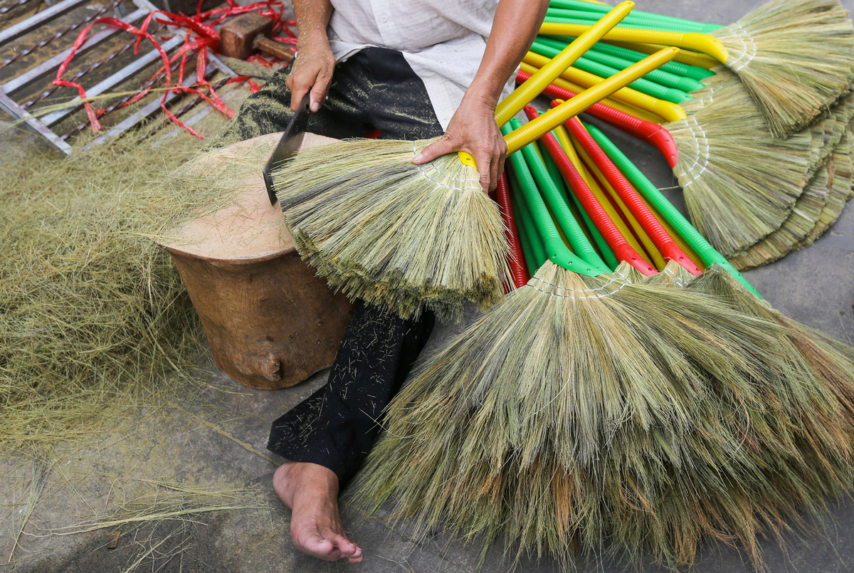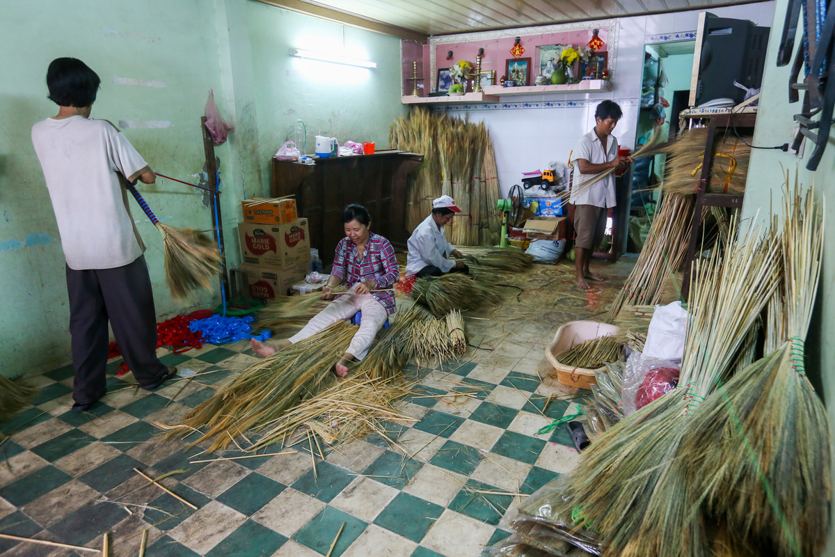 Công việc này cần chỗ làm rộng rãi, các cơ sở thường thuê ít nhất 4 nhân công. Mỗi người làm một công đoạn như tước bông, quấn dây, bện chổi…