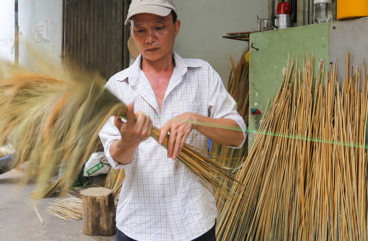 Ông Hồng dùng búa gỗ đập vào chổi để nén chặt các bó đót nhỏ cho đều lại với nhau. Ngày nào ông cũng từ xã Vĩnh Lộc (huyện Bình Chánh) lên đây làm chổi, được chủ trả từ 100.000 đến 150.000 đồng tùy số lượng làm được.