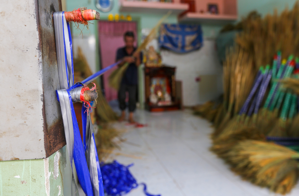 Ông Trần Minh Cường (43 tuổi) đã gắn bó bới nghề hơn hai chục năm. “Các bó đót nhỏ sẽ gộp lại để quấn thành bó lớn, tạo cây chổi thô. Đây là công đoạn quan trọng nhất vì chỉ cần quấn không đều, thiếu chật thì chổi sẽ tời ra hết. Vậy nên người làm phần này cần kinh nghiệm và được trả công cao hơn”, ông chia sẻ.