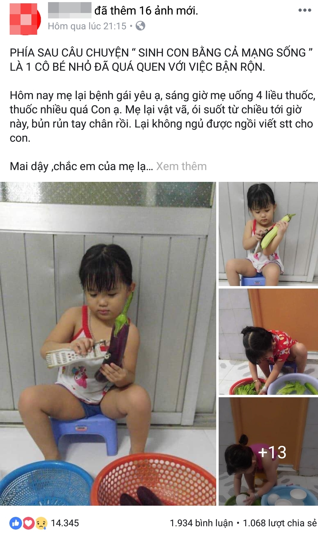 Những ngày qua, trên mạng xã hội đang xôn xao về bài viết “Phía sau câu chuyện ‘Sinh con bằng cả mạng sống’, là một cô bé nhỏ đã quen với việc bận rộn”, của một người mẹ trẻ, chia sẻ về việc con gái mình mới 4 tuổi đã quen làm các công việc trong nhà.